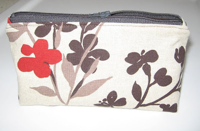 Here is the sample of the zippered cosmetics bag. I used Alexander Henry’s Bird Seed and lined it with some Amy Butler Full Moon Polka Dots. It is lined and has an interior pocket.