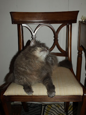 Here is the chair modeling with another recent in-law acquisition, the most lovely mid-century modern secretary in my guest room. I imagine my guests sitting in the chair, writing me love notes to leave behind after their stay.