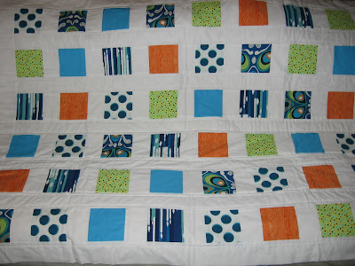 I used all Kona solids for the quilt, with a gray, sky blue, maze yellow and light green for the primary colors. I alternated darker shade of blue, gray and green for a little contrast. Man do I wish I kept it for myself.