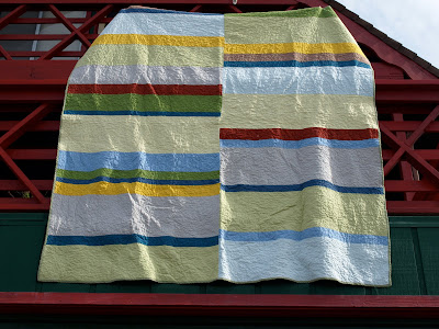 The twins’ mother made her feelings about pink pretty clear, so I picked up this awesome seersucker at Purl. It is made up of red, yellow and blue stripes. I backed it with a solid white and quilted it with the painted yellow thread.