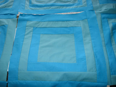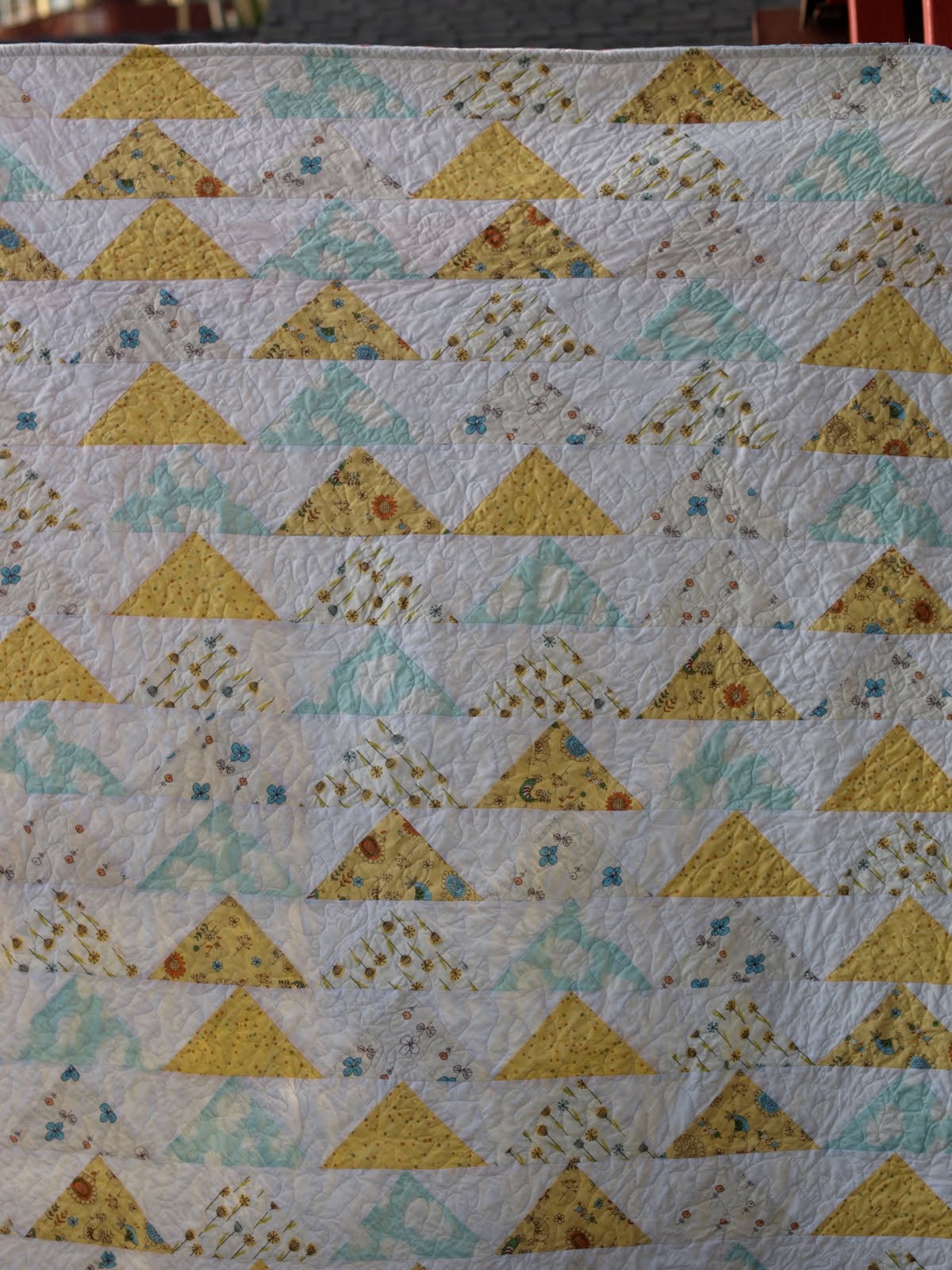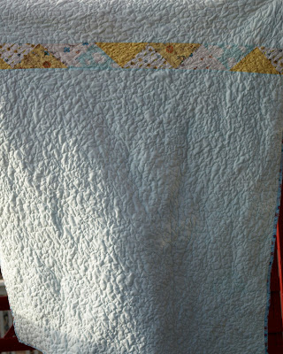 I had a tough time capturing the true colors of the quilt, which includes pale blue, pale yellow, unbleached muslin (used for the backing as well), medium blue, a yellow batik and a dark blue batik.