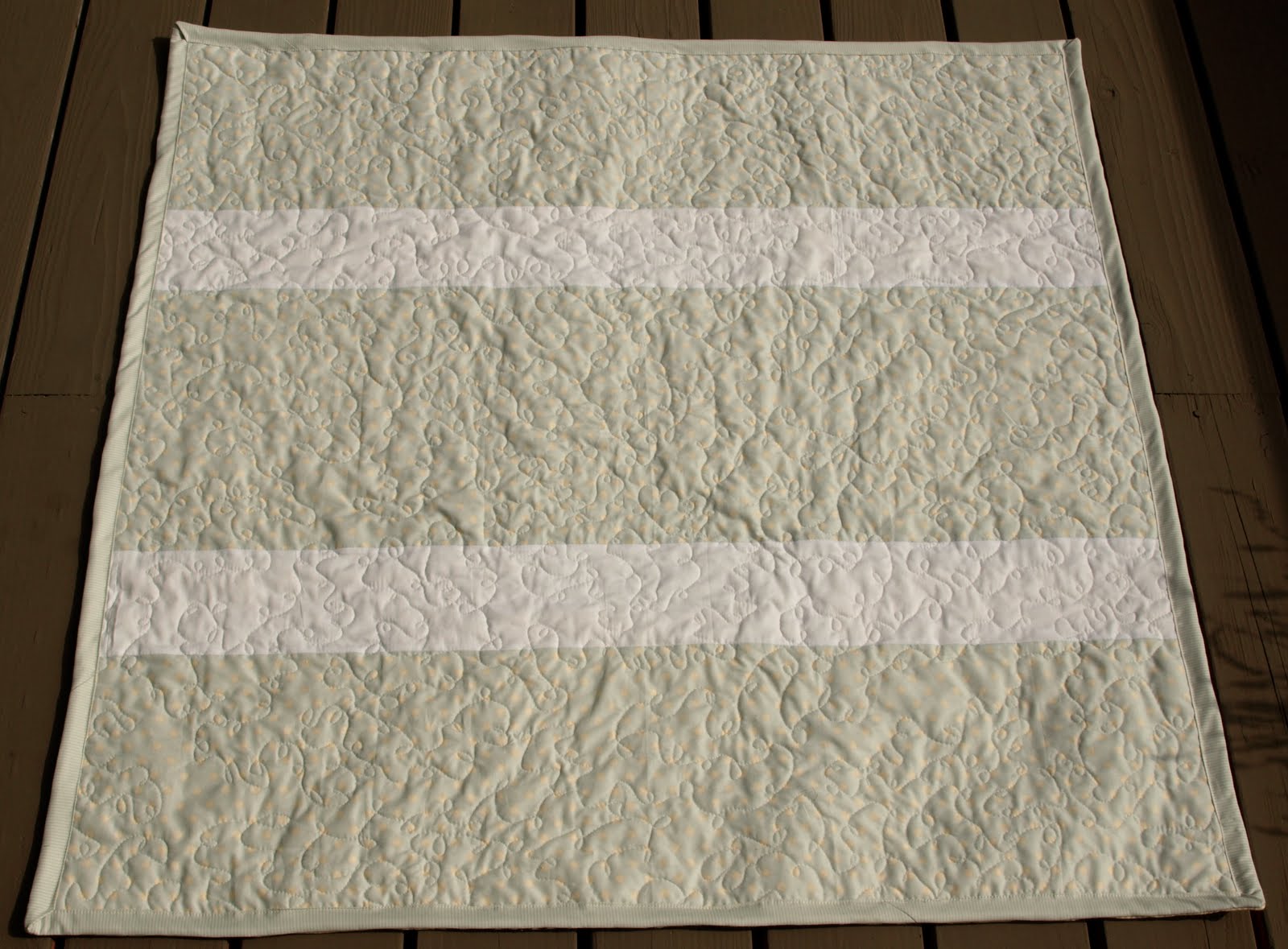 There are a bunch of tutorials online for flying geese that I fully intend on trying again sometime in the future, once I have recovered from this experience and sufficiently blocked it out. The good news is that the quilt looks pretty good and the stippling really helped. Luckily my girl hasn’t complained about it and in fact chose to roll over from her back to her front on it just last night. And nothing says acceptance and love like a major gross motor skill milestone!