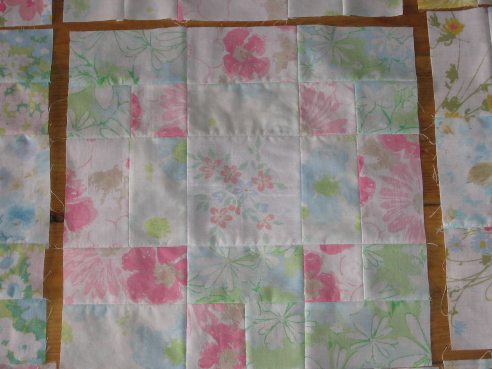 I had two sheets, a blue floral and a pink floral, and used one in each block to create cohesion throughout the blocks.
