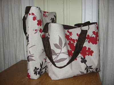 Here is the first picture of my favorite new bag. I picked up the material months ago after falling in love with the delicately embroidered flowers on a cream linen background. I lined it with rich, dark chocolate silk. It is nice and spacious and can carry everything I need for a day away from home.