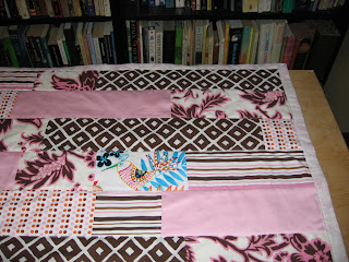 Ever since I learned that Simplicity did not make a compatible walking foot for my machine, I really started looking at my machine with new eyes, as if it had betrayed me and now all I could focus on was its faults. A little time trolling on the internet led me to a great deal on a Brother machine that came with all kinds of great quilting feet. The old machine is in a box; the new machine is all fired up and the rest you could say, is history. I tried out the elusive walking foot last night and it was everything I wanted and more. I quilted this little baby by sewing in the ditch, a fancy term for following the seam lines. I only quilted the vertical seams and did not quilt the short horizontal lines. Keeping the back of the quilt nice and visually simple seemed like a nice contrast to the fun and busy front.